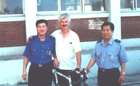 The police was proud of themselves and I did my best in complementing them. They did not accept my "ddok-kaps" (money), even after much pushing. I could only buy the chief and the officer-in-charge-of-my-case a coffee in the coffeeshop next door. Then, the officer-i-c-o-m-c (mr. Kim) took me to his home (he also drove me to the bus station on the day of the theft) and showed me his family or, maybe more applicable, showed his family a peculiar species of mankind, dressed in bicycle shorts. How exciting is the life of a police officer! Then mr. Kim took me to Namwon's tourist attraction no. 1, the Kwang Han Yoo park, in memory of the legend of Choon Hwang that took place there. Mr. Kim did not want me to leave his town before I had absorbed some Korean culture and I was grateful to him. Countryside people are nice after all. I bid him farewell at 11 o'clock and headed for Kunsan on my bike, on which a few items were missing, but which was further in a good state.