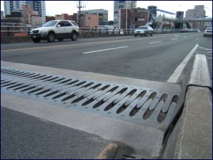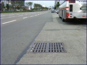 Drain grates in the road always have holes to let the water drain into the sewerage system. These holes have a long and narrow shape, but these holes can be wider than your bike tyre. If the long side of the hole is in the direction of the traffic flow, as in the photograph (Busan, Jurye subway station), it causes a great danger for bicycles. In fact the drain grates are square, so care should be taken that they are always placed in the way that the length of the hole is perpendicular to the traffic direction.