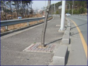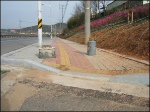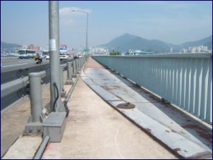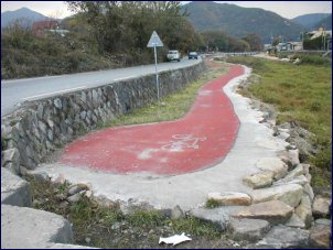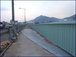 Especially outside Seoul, there are not many major bridges that have a bicycle lane. And if there is a bicycle lane, the access is in many cases very poor. Where cars climb onto a bridge with a gentle 3% slope, the cyclist in many cases has to carry his bike up stairs, or push it up a steep ramp, as in the photograph on the right (Nakdong River Main Bridge, Busan). Also notice the careless finishing work at the bottom end of the ramp.