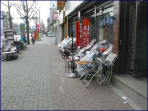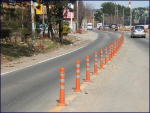 The picture on the right (Busan City) looks like a humoristic snapshot, but it is a very common situation. Bicycles are supposed to use the red coloured lane right next to the buildings. What about people that leave the shops? Fortunately accidents rarely occur, because no cyclist is crazy enough to try to stay in this lane. It's the authorities that make themselves ridiculous by spending so much on creating more danger. No need to spend more money to remove them: nobody notices these lanes anyway.