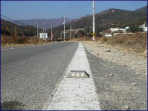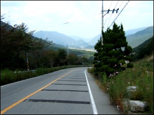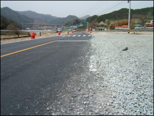 Especially in front of restaurants, but also a temporary road pavement, often coarse aggregate is used. The car tyres 'catch' the stones and take it to the main road. it is extremely dangerous for cyclists and the use of aggregate as pavement should be abandonned. (photo: Road no. 19 near Muju, Jeolla bukdo) |
