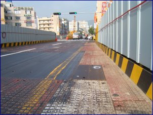 Just before I took the picture to the right (Busan, Suyeong Bridge no. 2), this evil grinning monster devoured one tyre and two inner tubes of my racing bike. These holes are wide enough for normal bike tyres to get trapped too. At this place, the (too narrow) bike / pedestrian lane was blocked by a compressor that was left there. The message here is "Think of the bicycles when creating or altering traffic situations!"