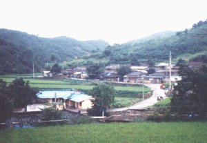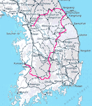 The police was proud of themselves and I did my best in complementing them. They did not accept my "ddok-kaps" (money), even after much pushing. I could only buy the chief and the officer-in-charge-of-my-case a coffee in the coffeeshop next door. Then, the officer-i-c-o-m-c (mr. Kim) took me to his home (he also drove me to the bus station on the day of the theft) and showed me his family or, maybe more applicable, showed his family a peculiar species of mankind, dressed in bicycle shorts. How exciting is the life of a police officer! Then mr. Kim took me to Namwon's tourist attraction no. 1, the Kwang Han Yoo park, in memory of the legend of Choon Hwang that took place there. Mr. Kim did not want me to leave his town before I had absorbed some Korean culture and I was grateful to him. Countryside people are nice after all. I bid him farewell at 11 o'clock and headed for Kunsan on my bike, on which a few items were missing, but which was further in a good state.