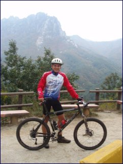Het landschap in de bergen was onvergetelijk mooi, zodat ik aan het eind van de dag al bijna vergeten was dat mijn benen toch wel een beetje moe waren. Koreanen die ik gesproken heb, kunnen op voorhand amper geloven dat je zo'n afstand in 1 dag op de fiets kunt afleggen. Wel heb ik gemerkt dat het aantal fietsende Koreanen snel toeneemt. Ik heb nog nooit zoveel fiets winkels gezien als deze keer. "Levensgevaarlijk" was de tocht over het fiets pad langs de rivier. Ik was al gewaarschuwd dat de Koreaanse automobilisten geen fietsers kennen. De wandelaars over de weg (wat naar mijn mening toch een fietspad was), rekenen absoluut niet op de snelheid van een beetje geoefende toerfietser. Het gevaar dat ik beschreef zat dan ook mn in het laatste stuk: met >30 k/h langs de Han Rivier tussen de wandelaars door in het donker met nogal wat "bijna"- ongelukken als gevolg. Veel fietsers tuffen op lage snelheid en wandelaars lopen zowel links als rechts. In het auto verkeer is rechts inhalen vrij normaal. Op de fiets is een soort van regel "rechts rijden" dan ook nog niet uitgevonden.